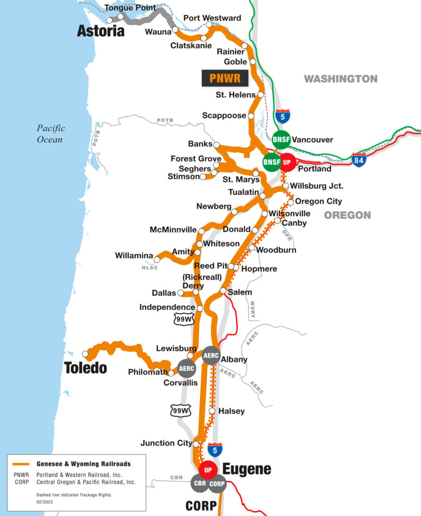 A new on-property agreement has been ratified between 55 Brotherhood of Locomotive Engineers and Trainmen (BLET) members and Genesee & Wyoming’s Portland & Western Railroad (PNWR), a 516-mile Class II that operates throughout Washington and Oregon and interchanges with BNSF (at Vancouver, Wash., and Portland, Ore.) and Union Pacific (at Eugene, Ore., and Portland, Ore.).