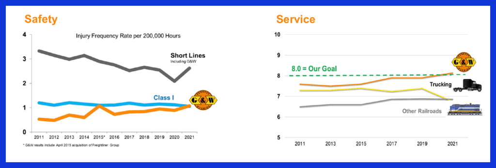There’s lots of high-growth local short line service seen across America. Growth is not a monopoly of the Class I’s—far from it. As Michael Miller pointed out, both G&W and other North American short line carriers seem to have had significantly higher local carload freight volume growth than do the Class I’s. Why not explore that shift pattern further? Prove or disprove it? After all, G&W has operated with a superior safety record and excellent customer service delivery—perhaps far better than many Class I’s.