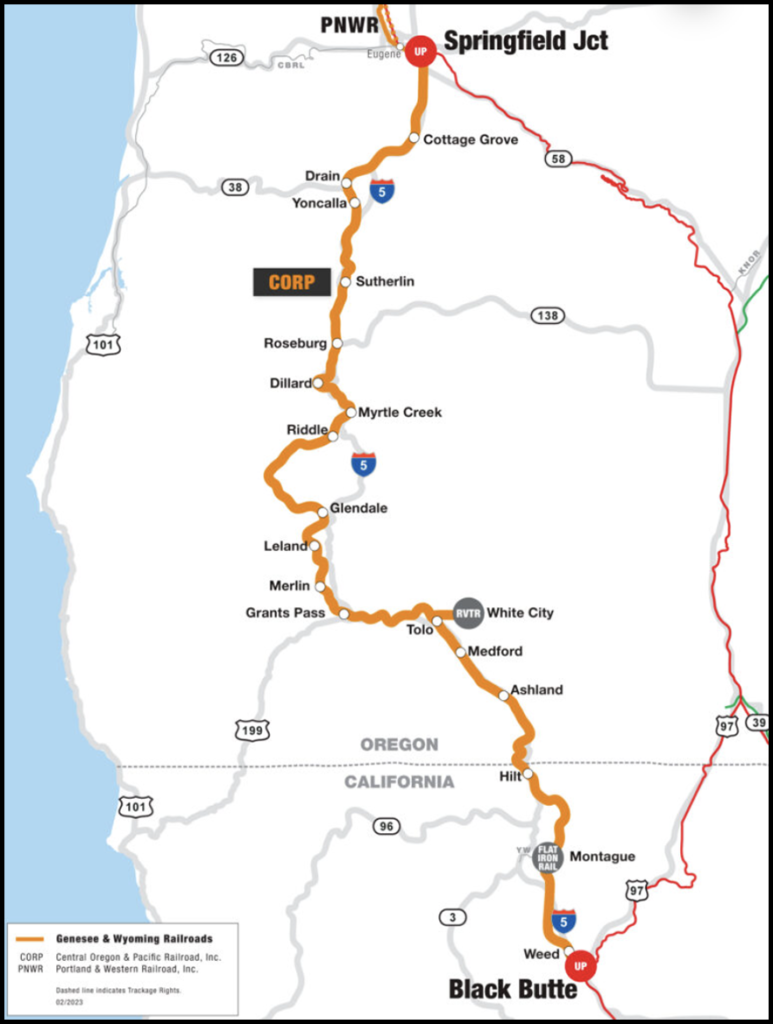 Cathcart on June 24 reported being selected by CORP, a Genesee & Wyoming subsidiary (see map, right), to provide railcar inspection and repair services across the 362-mile railroad’s major yards in Roseburg, Cottage Grove, and Medford, Ore. Cathcart started work as CORP’s sponsored repair agent in May, with a team of eight carmen and a location supervisor.