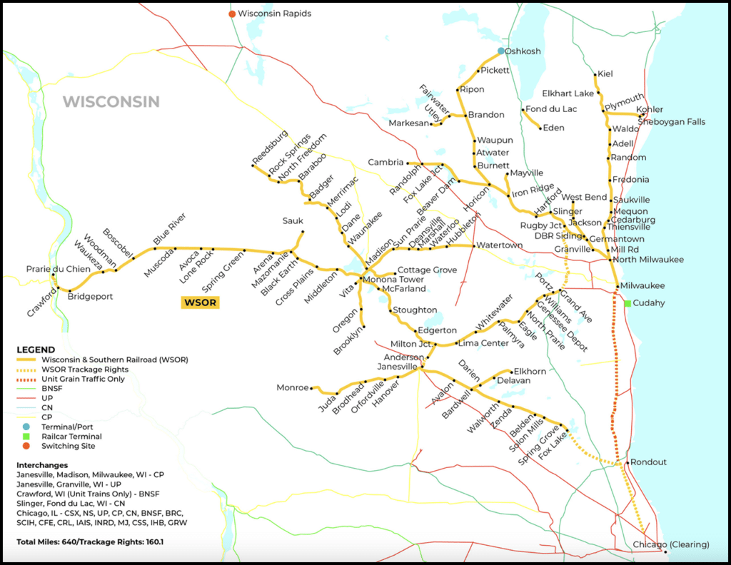 With 808.59 track miles (see map above), WSOR primarily hauls forest products, fertilizers, grain (corn, soybeans, and wheat), plastics, consumer foods, paper, aggregates, chemicals, frac sand, ethanol, and liquid petroleum.