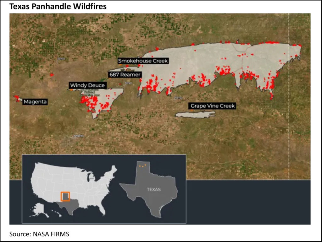 While it’s still technically winter, that hasn’t stopped the largest wildfire in Texas history raging in the panhandle, northeast of Amarillo. There aren’t many people living in this part of the world, but there are two critically important rail routes: the double-track main transcontinental lines for BNSF (Southern Transcon) and Union Pacific, which cut diagonally across the northern edge of the panhandle.