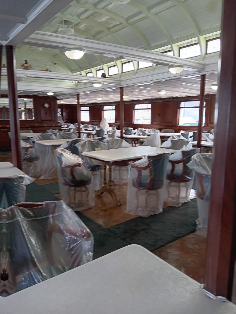 The Keewatin left Port McNicoll for the last time on April 24, 2023, arriving in Hamilton on April 29. The journey took it through Georgian Bay, Lake Huron and Lake Erie, the Welland Canal, and part of Lake Ontario. At the Heddle Shipyard, the Keewatin was moored at the company’s dock, and work soon commenced. The superstructure was repaired and waterproofed, and deteriorated wooden planking was lifted from the steel deck.