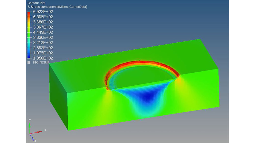 Figure 5: Plot of stresses in material surrounding a fatigue defect in a computational model of wheel/rail contact. (Courtesy of Gary T. Fry.)