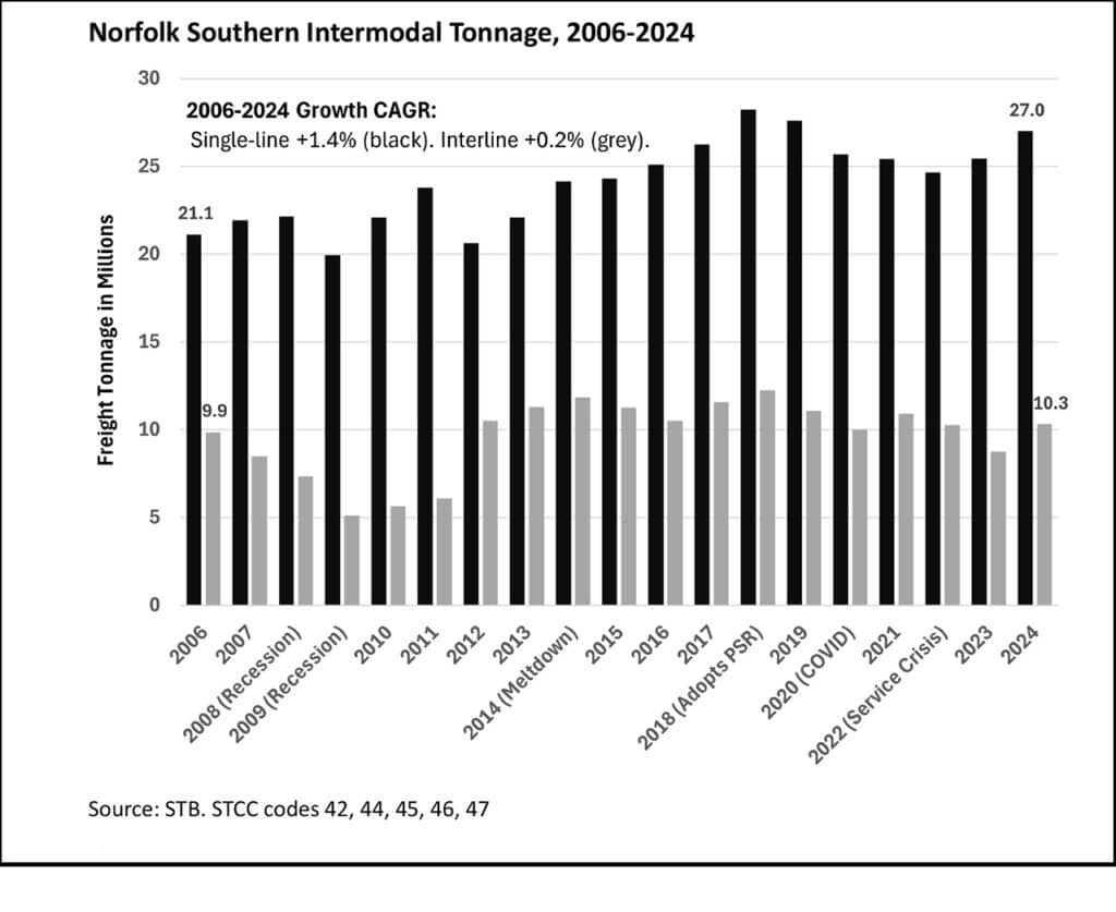 Total intermodal tonnage starts at 27 million in 2006, takes a hit during the financial crisis and fails to bounce back, and then tails off again following the PSR adoption in 2018 and associated lane rationalization. There’s a modest bounce back to 17 million tons in 2024, but we’re still looking at a dismal tonnage CAGR of –2.5% over the period; due in part to average weight per load falling from 12.1 to 10.6 tons. Interline fared even worse, shedding an additional five million tons at a CAGR of –3.3%.