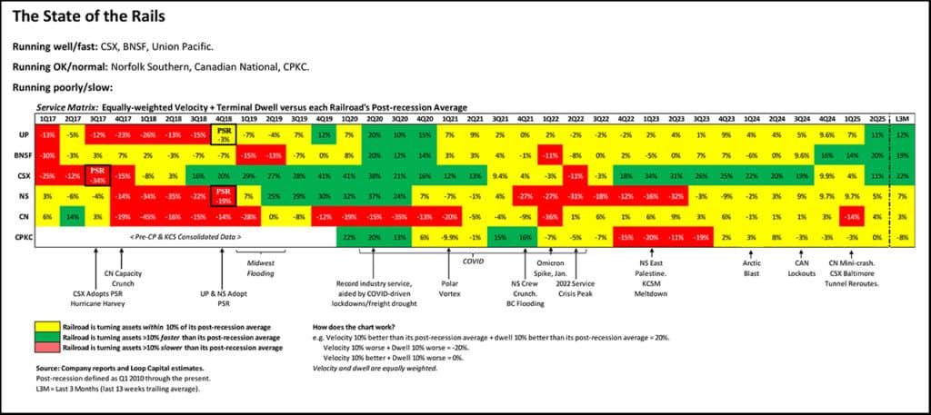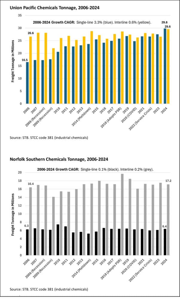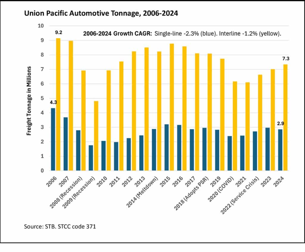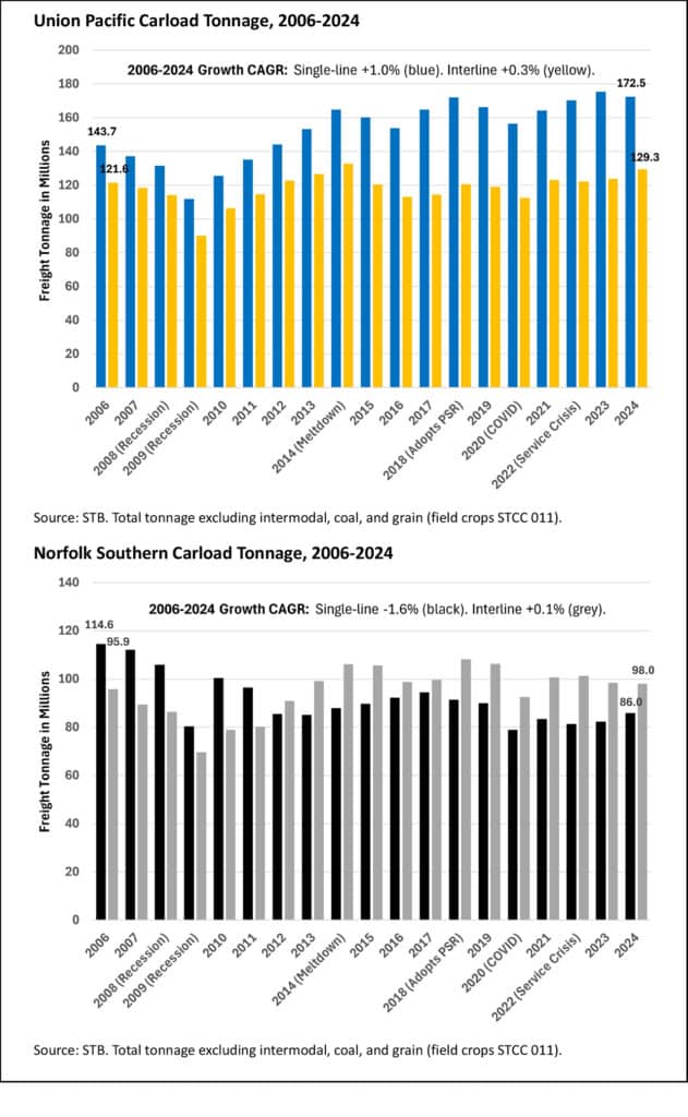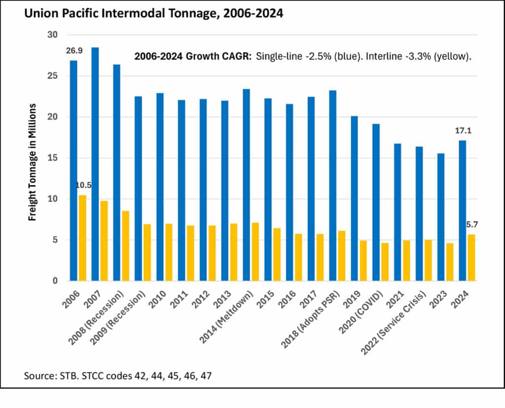 We’ll skip charts here because these aren’t service-sensitive commodities, and this section of the report is getting too long, but for the record: Between 2006-2024, Union Pacific single-line coal tonnage fell from 164 to 57 million (–5.7% CAGR) and interline tonnage from 98 to 19 million (–8.7% CAGR).