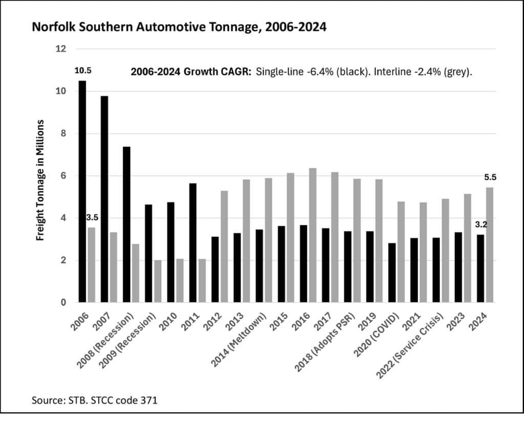 If we run the same analysis for Norfolk Southern, the picture isn’t so tidy, with single-line underperforming interchange over the period. Single-line tonnage fell from 115 to 86 million tons, a –1.6% CAGR, due in part to three meltdowns in 2014, 2018 and 2022, and the switch to PSR in 2018, with its associated lane rationalization and hump yard closures (UP also adopted PSR in 2018 and had one less meltdown). In contrast, interline tonnage was 2.1 million tons higher over the same period.