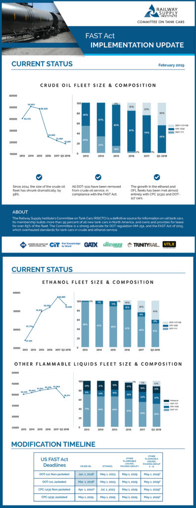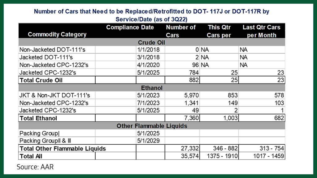 *EDITOR’S NOTE: According to Railway Supply Institute Tank Car Commitee data, the number of tank cars still to be upgraded to DOT-117R (retrofit) standards is small, and the deadline is, in any case, 2023 or 2025. DOT’s proposal does not apply and its information is incorrect, as far as DOT-117 cars are concerned. The 2029 deadline only applies to tank cars for Packing Groups I, II and III, “Other Flammable Liquids”—not crude oil and ethanol. In fact, retrofits of crude oil and ethanol tank cars are progressing at a steady pace and are on target to meet or exceed the deadlines.