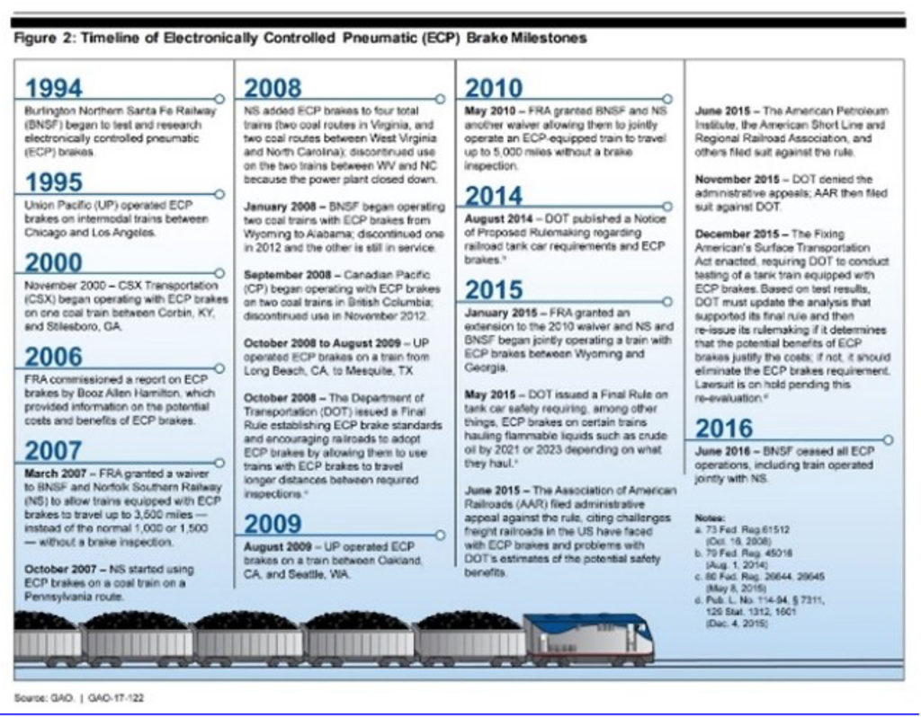 Homendy pointed to a U.S. General Accountability Office (USGAO) graphic explaining how a December 2015 FAST Act directive resulted in PHMSA (Pipeline and Hazardous Materials Administration) withdrawing the ECP brake rule on Sept. 24, 2018: