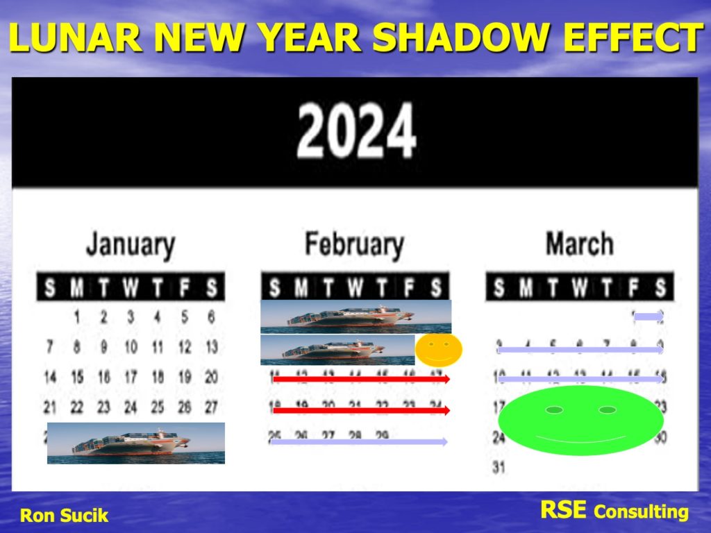 A few years back, I coined the phrase “Lunar New Year Shadow Effect” as it related to the volume of import containers coming from Asia and for the most part China. As a refresher, think of the Lunar New Year date. Realize that on that date the largest human migration in the world takes place as most Chinese laborers travel back to their home villages for the holiday and the manufacturing plants shut down for two weeks.