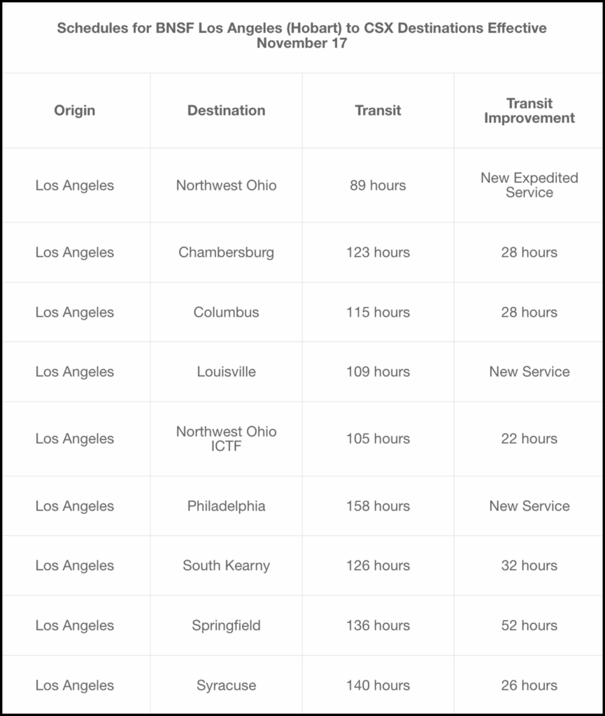 In an online customer notification, BNSF reported offering “new, faster five-day-a-week schedules from Los Angeles to many CSX destinations, as well as new service lanes,” including: