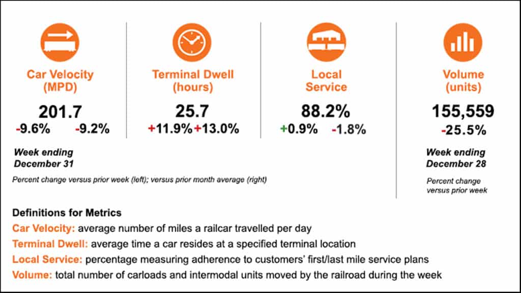 BNSF intermodal operating metrics for the week ending Dec. 31. 3, 2025 declined, but the railroad said they “are showing signs of recovery, returning to pre-holiday levels with significant improvements in velocity and dwell over the past few days. Our local service compliance measure improved vs. the previous week but is down from the previous month.”