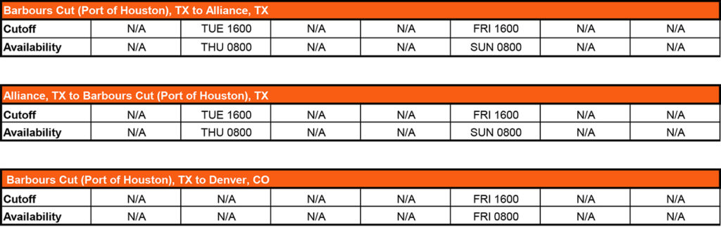 The new on-dock terminal rail option leverages live lift capabilities and other expanded capacity and technology advancements at BNSF’s Alliance, Tex. Intermodal Facility to serve the greater Dallas/Fort Worth and Denver markets. Service will begin to be offered to/from the Barbours Cut Container Terminal to Alliance, as well as from Barbours Cut to BNSF’s Denver Intermodal Facility, beginning June 2, 2023.