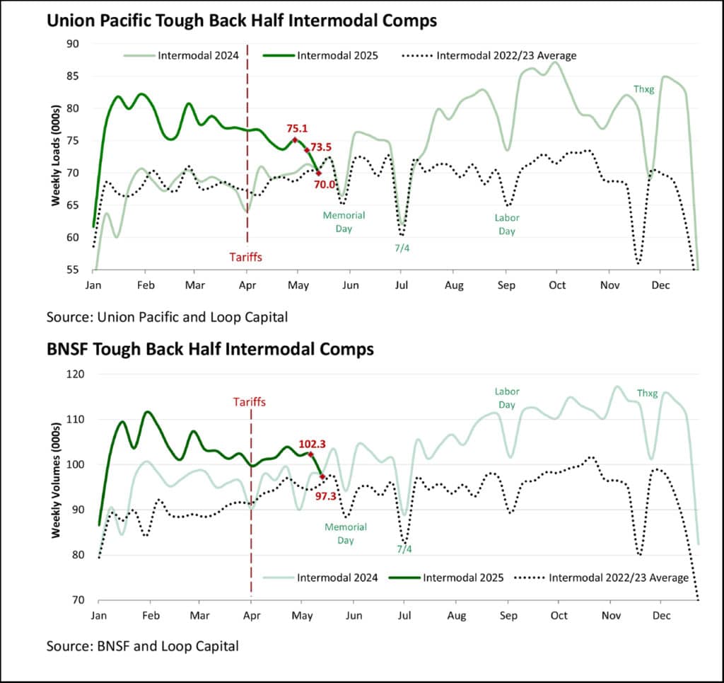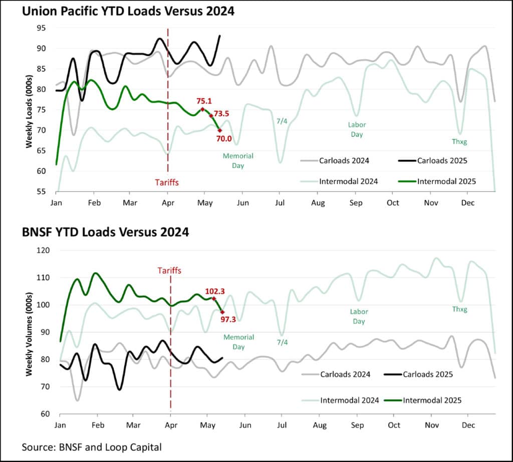The same chart for BNSF shows the China effect only really visible in the past reported week, ending May 17 (so a five-week lag from the 145% announcement), when total loads fell from 102,000 to 97,000 loads. We’ll be dealing with the China air pocket for another two or three weeks in data terms, after which we’ll see a “relief rally” in import volumes, reflecting the de-escalation in the U.S. tariff from 145% to 30% announced May 12.