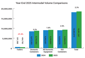 Total intermodal volume fell 2.0% year-over-year in fourth-quarter 2025, the Intermodal Association of North America (IANA) reported Feb. 16. While domestic container originations grew 2.2%, international containers declined 4.7%, and trailers dropped 23.1%. For the year, total volume rose 2.3%.