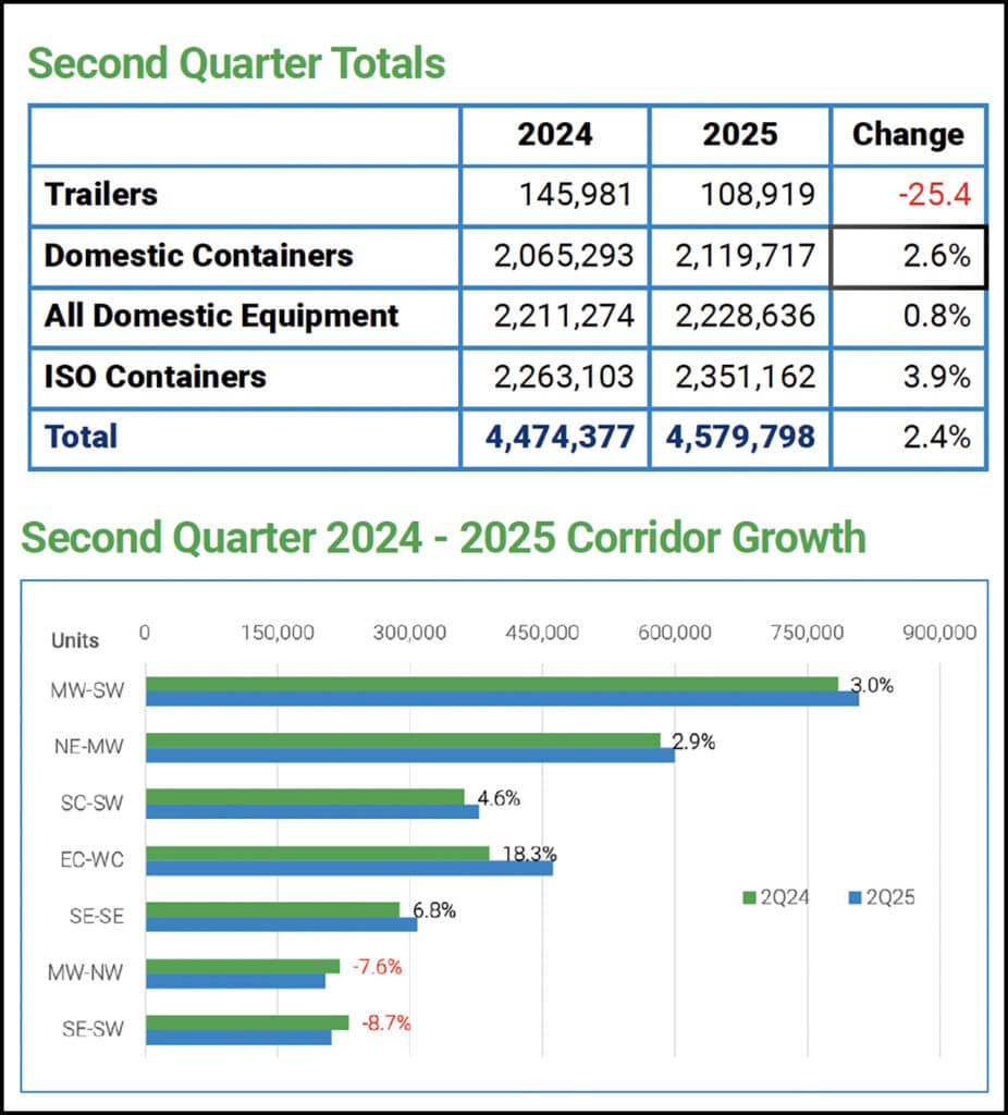 For second-quarter 2025, international containers were up 3.9% and domestic containers improved 2.6%, while trailers fell 25.4% (see chart, top).