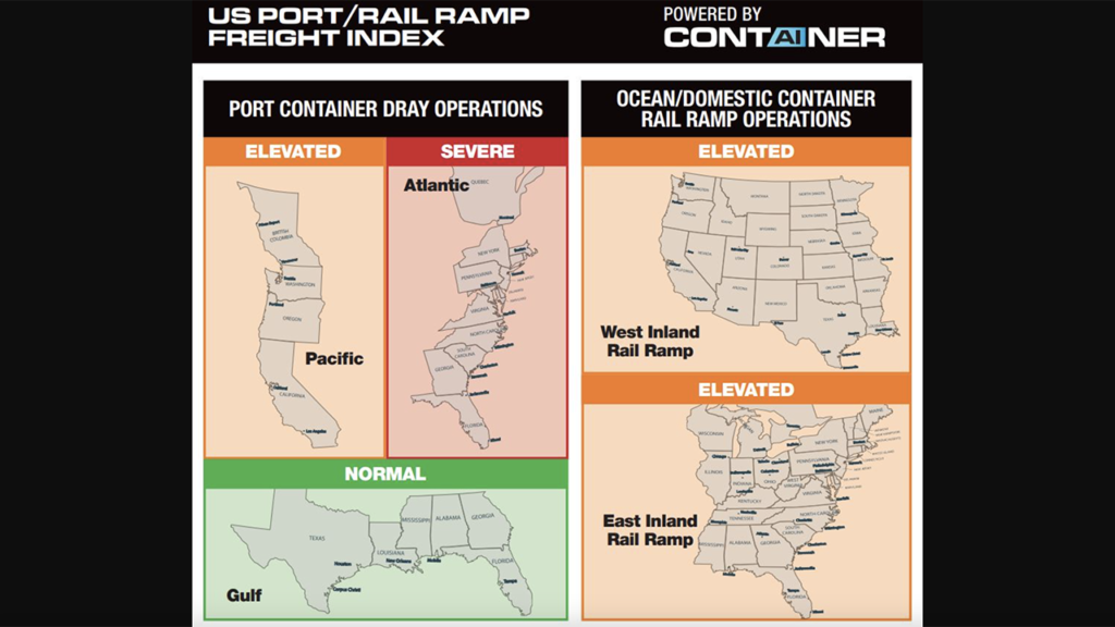 ITS Logistics said that in response to the challenges brought on by the bridge collapse, it has moved all rail regions and the Pacific Ocean region to “elevated concern.” The Atlantic Ocean region, it said, “will be moved to ‘severe’ due to shippers not having visibility of their freight being diverted to new ports and terminals throughout the U.S. East Coast, which increases the likelihood of demurrage with containers not booked to the door with ocean carriers.”