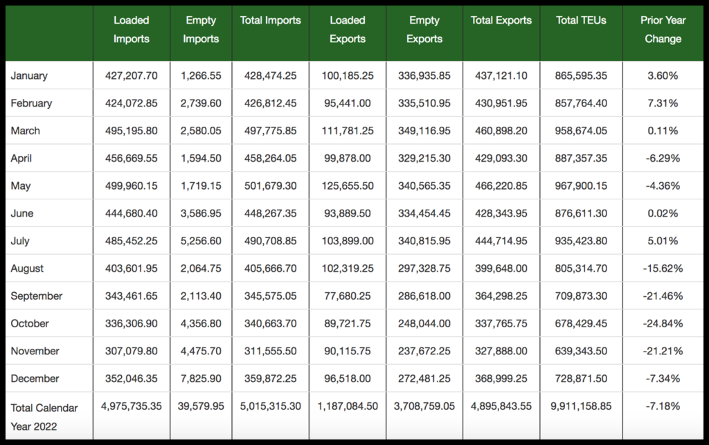 According to POLB, trade was down 27.9% in December 2022 compared with the same period in 2021 with 544,104 TEUs moved. Imports dropped 32.6% to 241,643 TEUs, while exports increased 1.6% to 115,782 TEUs. Empty containers were down 33.7% to 186,680 TEUs.