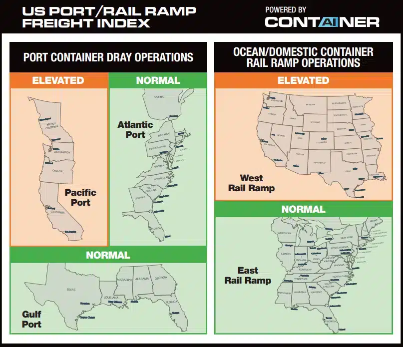 Additionally, ocean container rail traffic off the U.S. West Coast “continues to be problematic” as the rail infrastructure cannot keep up with additional volumes coming into Seattle and Los Angeles, according to the Nevada-based third-party logistics (3PL) firm, which each month releases an index that forecasts port container and dray operations for the Pacific, Atlantic and Gulf regions, and highlights ocean and domestic container rail ramp operations for the West and East Inland regions (see below).
