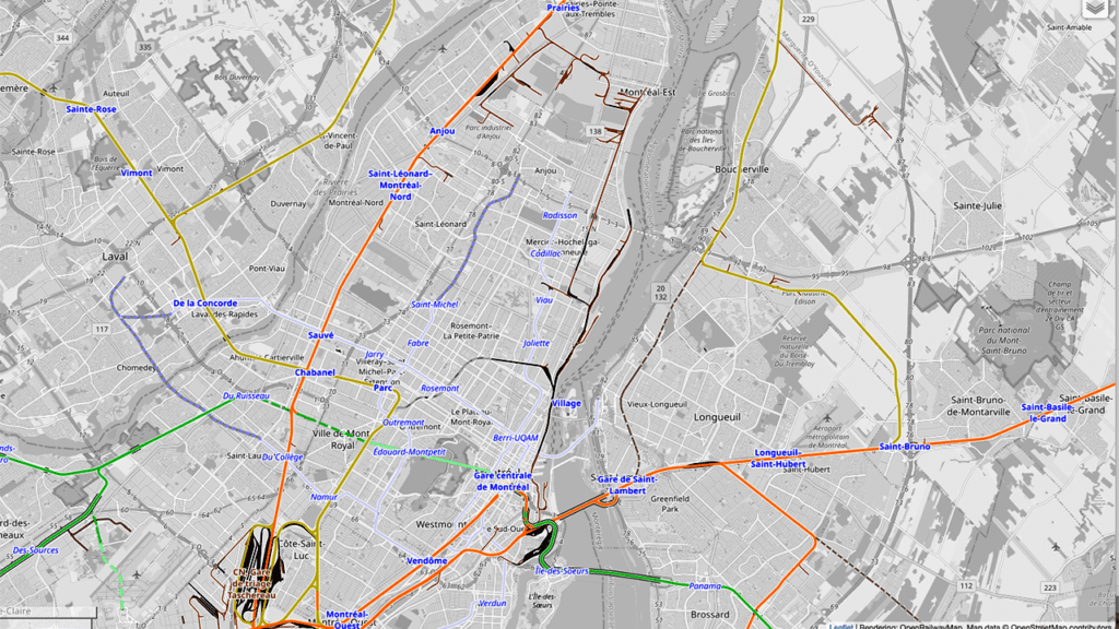 Rail infrastructure in and around the Port of Montreal. OpenRailwayMap.org