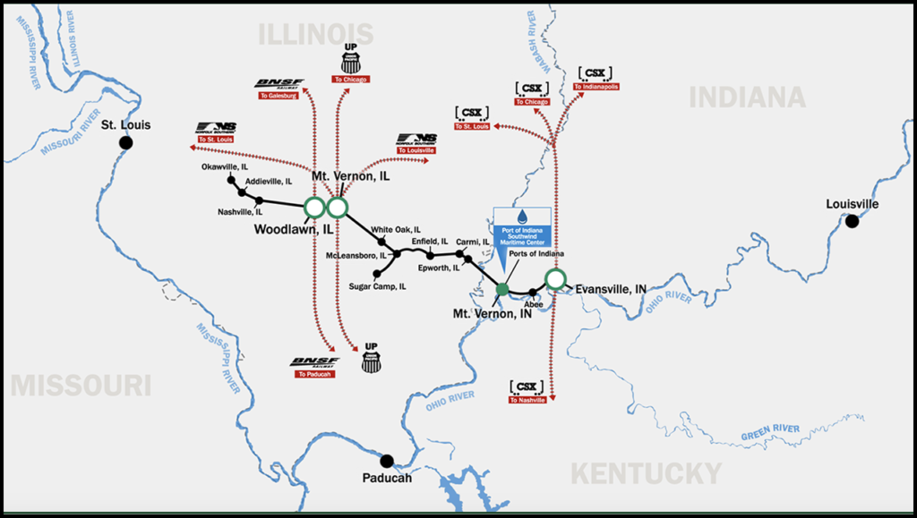 Located in southwestern Indiana, 15 miles west of Evansville, the Ports of Indiana-Mount Vernon is the closest major port to the confluence of the Mississippi and Ohio rivers. It connects with Evansville Western Railway, which interchanges with BNSF, CSX, Norfolk Southern and Union Pacific (see map above).