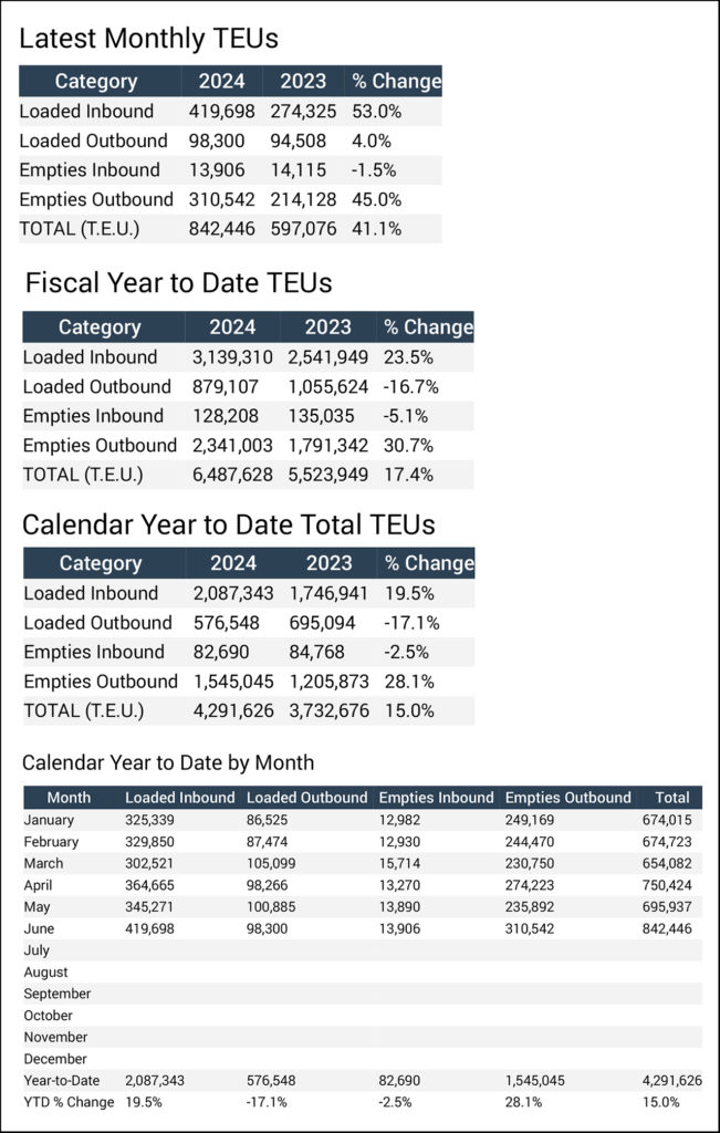 The Port of Long Beach (POLB) set a TEU record for June, moving 842,446 TEUs (twenty-foot equivalent units), up 41.1% from the same month last year and surpassing the previous record set in June 2022 by 7,034 TEUs. Imports jumped 53% to 419,698 TEUs, exports rose 4% to 98,300 TEUs, and empty containers increased 42.1% to 324,448 TEUs. POLB moved approximately 4.3 million TEUs during 2024’s first half, up 15% from the same period last year.