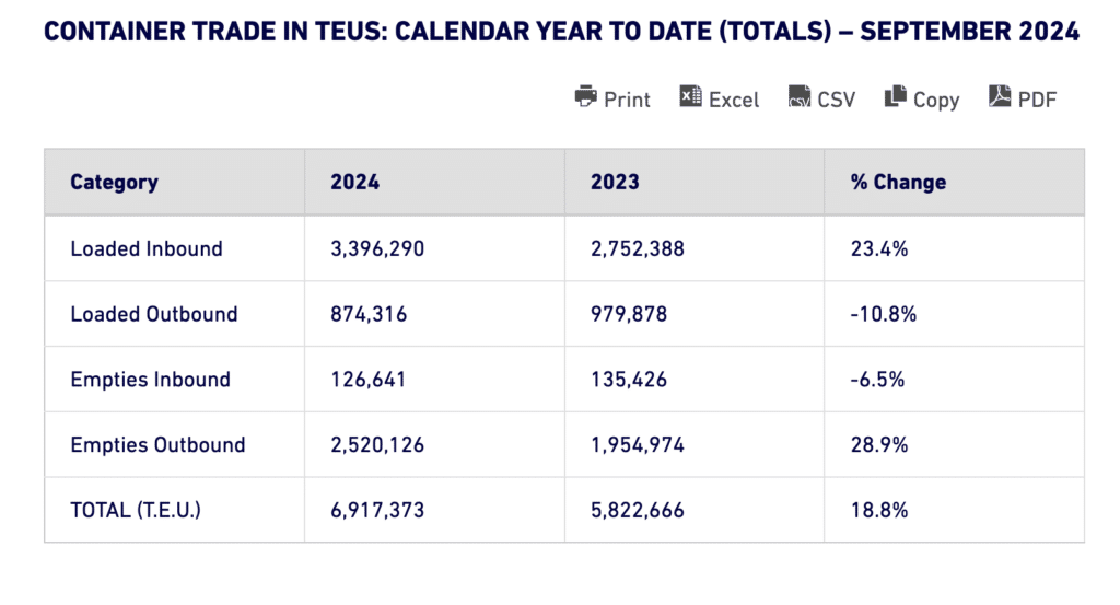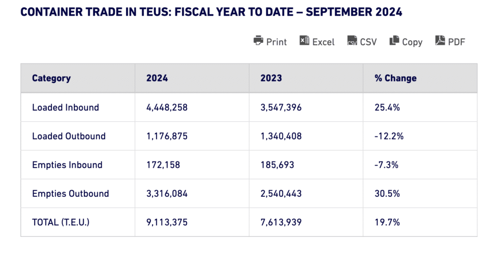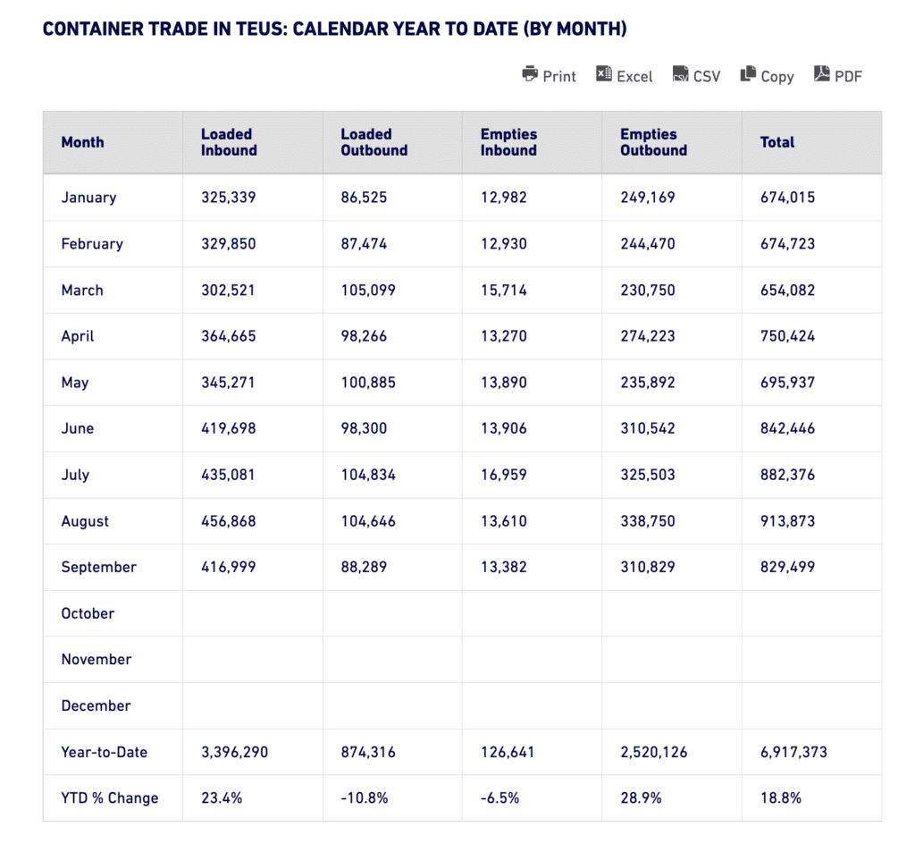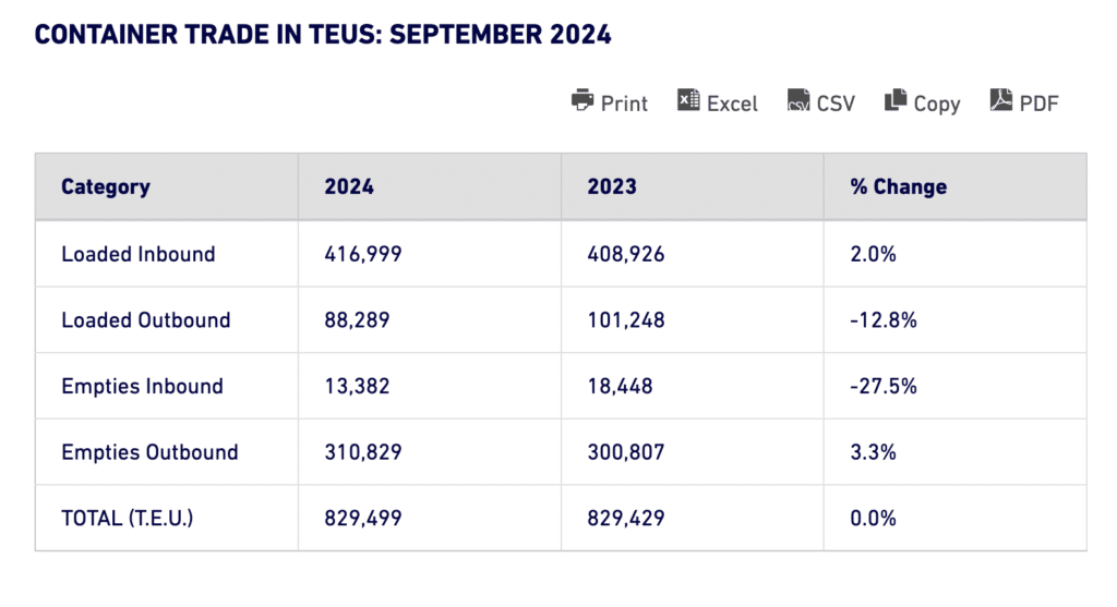 The Port of Long Beach (POLB) set a TEU (twenty-foot equivalent unit) record for September, moving 829,499 TEUs, up 70 TEUs from the previous record set in September 2023. September also marked POLB’s fourth consecutive monthly year-over-year cargo increase. Imports increased 2% to 416,999 TEUs, exports declined 12.8% to 88,289 TEUs and empty containers moving through POLB rose 1.5% to 324,211 TEUs.