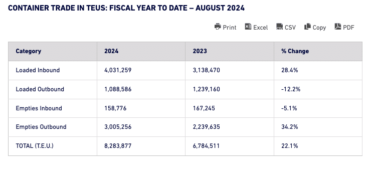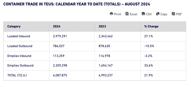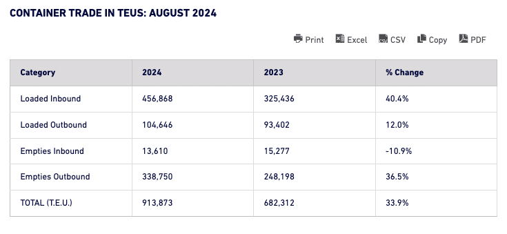The Port has moved 6,087,875 TEUs during the first eight months of 2024, up 21.9% from the same period last year.