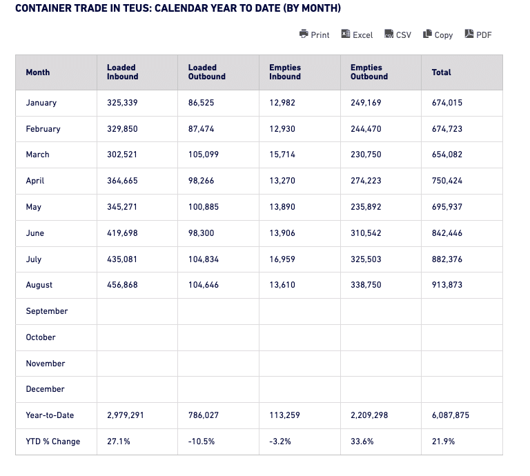 Imports jumped 40.4% from August 2023 to 456,868 TEUs, exports rose 12% to 104,646 TEUs and empty containers moved through the port increased 33.7% to 352,360 TEUs. In addition to being the port’s third consecutive monthly year-over-year increase, August also marked only the second time the port has exceeded 900,000 TEUs in a single month.