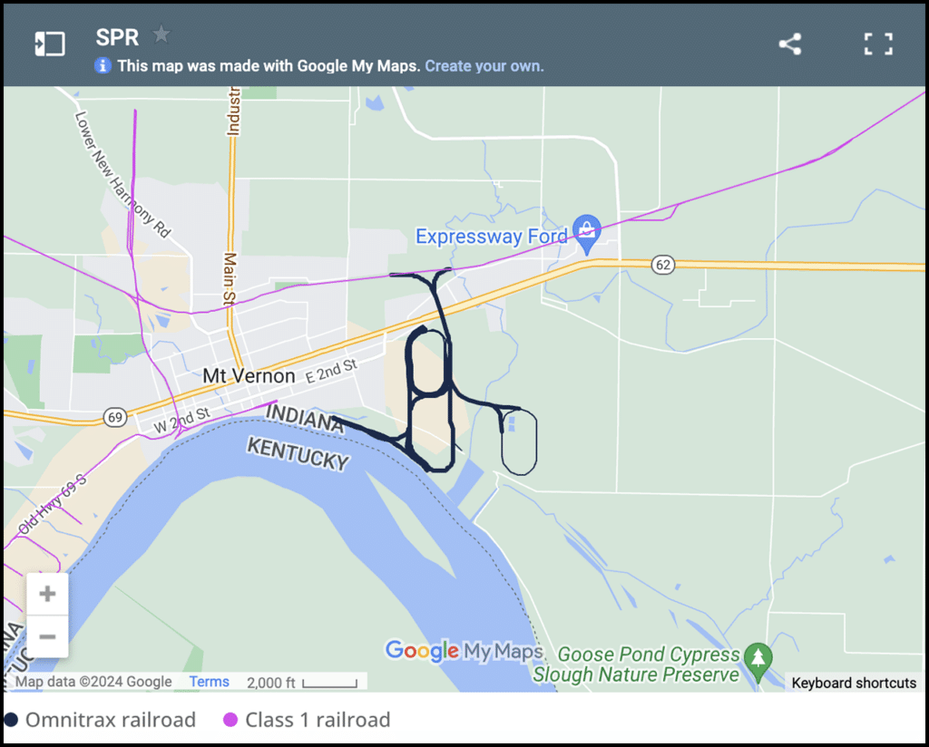 Also in 2024, OmniTRAX was selected as the exclusive rail operator at Mount Vernon and on Aug. 1 began providing switching, sorting and other services. The 8.2-mile Mount Vernon Railroad (see map above) coordinates rail connections and assembles outbound trains for interchange with the Evansville Western Railway (see map below), which provides direct access to BNSF, CSX, Norfolk Southern and Union Pacific.