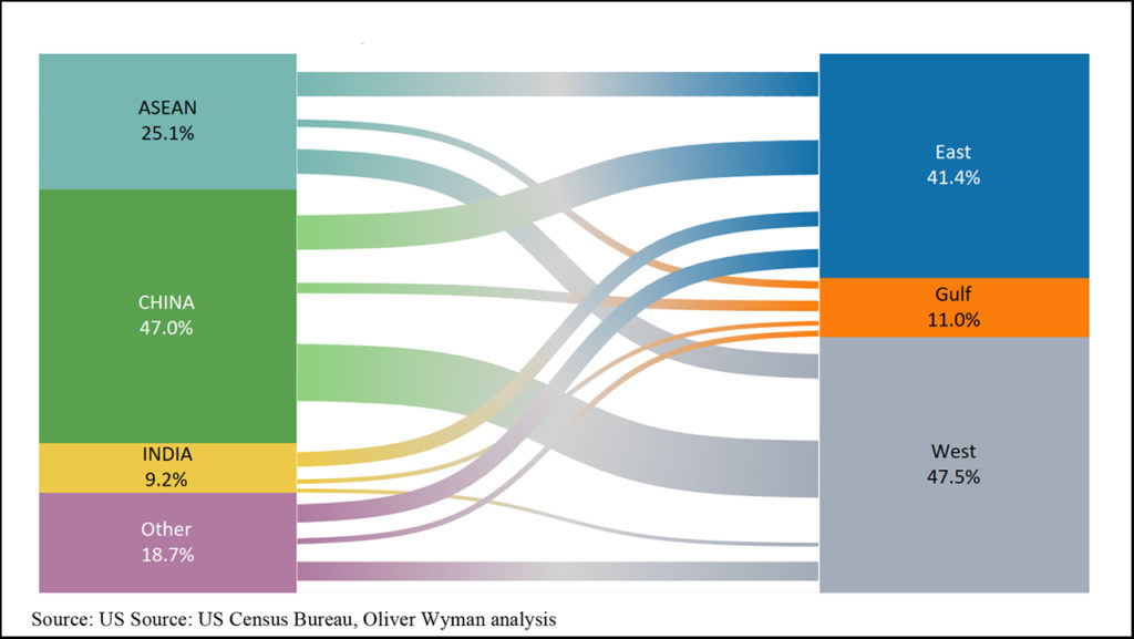 Shipping patterns for U.S. container imports from Asia are changing, driven by a myriad of factors, from the COVID-19 pandemic and subsequent supply chain disruptions to new geographic product sources and expanded ship routing and port choices. Oliver Wyman’s research shows that a shift in imports from West Coast to East Coast may be accelerating—which is changing competitive pressures on port and inland transportation options.