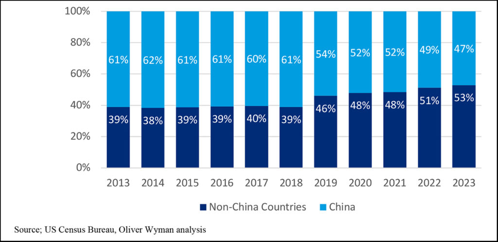 For more than a decade, China has been the largest source of U.S. imports, with U.S. West Coast ports the primary gateway for those goods to enter the country. Even today, nearly half of U.S. containerized imports from Asia originate from China (Exhibit 1) and pass through West Coast ports. But the gap between China and other Asian countries as sources for U.S. goods has been narrowing in recent years (Exhibit 2). This trend became clear starting in 2018 with the genesis of the U.S.-China trade war and was further accelerated by the supply chain disruptions associated with COVID-19. The pandemic clarified the risk to shippers of having only one supplier and the need to diversify their supply chains.