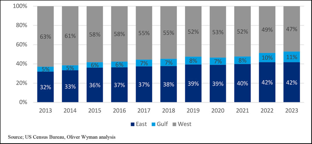 While political or geographic instabilities, such as the drought impacting the Panama Canal or the Red Sea crisis can impact container volumes in the short term, the trend over the past decade shows a clear and continuing shift in Asian container imports from the U.S. West Coast to the East Coast.