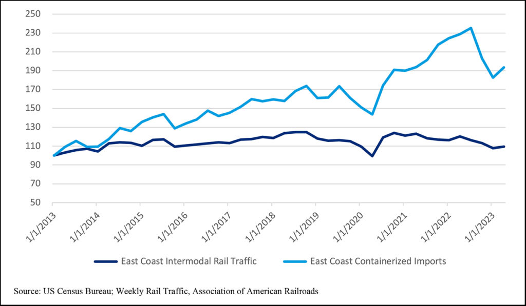 Capturing more East Coast container traffic, however, will require railroads to continue adopting more service-focused initiatives to attract and retain shippers. These include expanded on-dock rail capabilities, greater reliability and on-time performance, and tighter first- and last-mile coordination. Given the strong growth outlook for East Coast container imports—particularly as more shippers deploy diversification strategies to combat supply chain disruption—railroads will want to ensure they are maximizing their competitiveness, in terms of both customer service and economics.