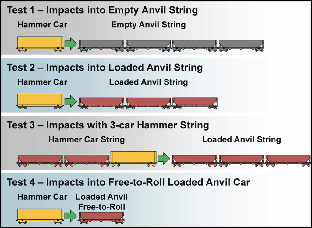 Test 1 is a scenario similar to the Standard Impact Test from the Closed Car Loading Standards. The Test 2 scenario resembles the AAR Manual of Standards and Recommended Practices (MSRP) Section B, Specification M-921B2 Impact Performance Test used for evaluating 15-inch EOCC units. Test 3 represents a flat switching event, which is the most common type of impact scenario encountered in revenue service. Test 4 is a scenario similar to the Impact Test Setup for evaluating hybrid draft systems found in MSRP Section B, Specification M-902.3 Depending on the specific test scenario, the hammer car was impacted into the stationary anvil car in both the forward and reverse directions at various speeds from 1 to 8 mph.