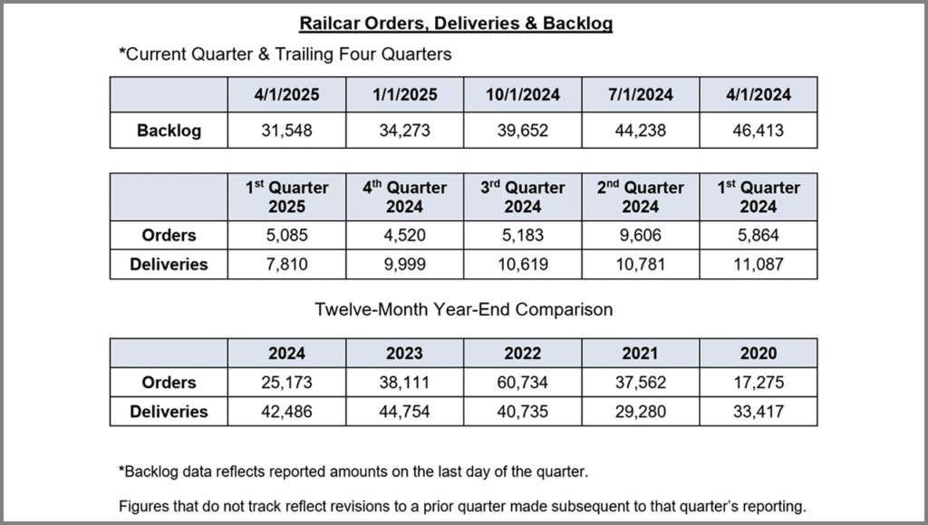 For the three-months ending March 31, 2025, orders came in at 5,085 railcars, up 13% from fourth-quarter 2024’s 4,520 and down 15% from first-quarter 2024’s 5,864. Deliveries were 7,810 units, down 22% from fourth-quarter 2024’s 9,999 and down 30% from first-quarter 2024. Backlog for this year’s first quarter was 31,548, decreasing 8% sequentially and 47% year-over-year (see chart below).