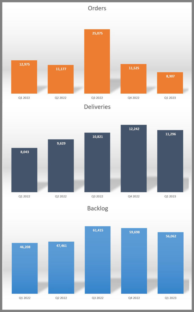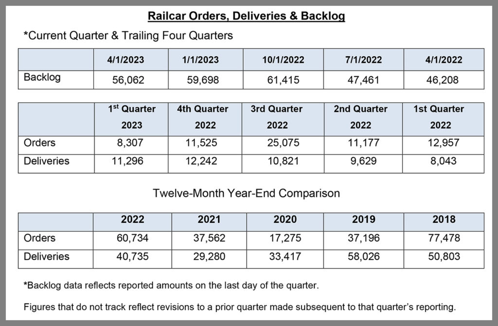 Newly released data by the Railway Supply Institute (RSI) American Railway Car Institute Committee (ARCI) shows slight declines in railcar backlog, orders and deliveries in 2023’s first quarter, compared to fourth-quarter 2022. However, Deliveries rose 40% and the backlog rose 23%, compared to first-quarter 2022 data.
