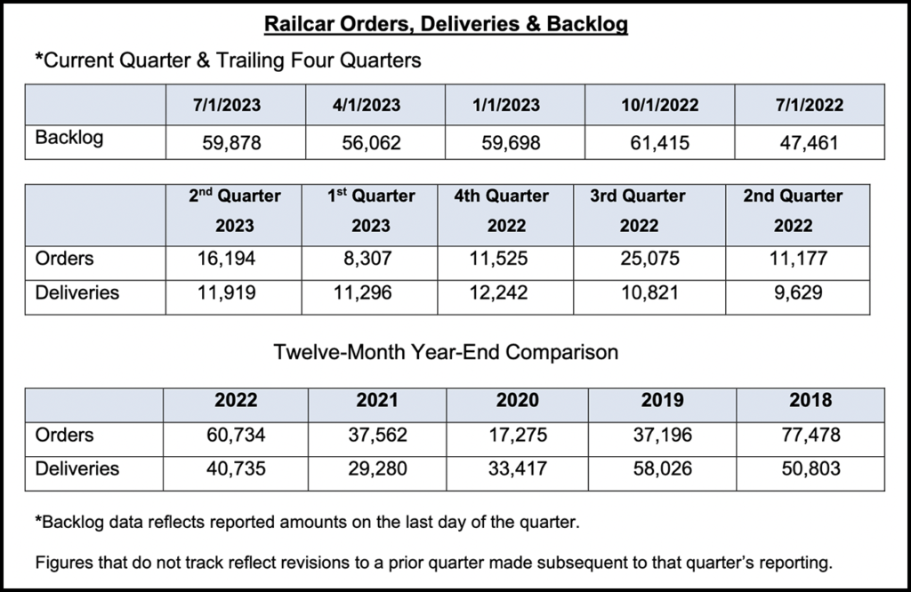 Newly released data by the Railway Supply Institute (RSI) American Railway Car Institute Committee (ARCI) shows increases in railcar orders, deliveries and backlog in 2023’s second quarter—both sequentially and year-over-year.