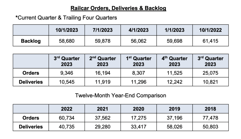 Newly released data by the Railway Supply Institute (RSI) American Railway Car Institute Committee (ARCI) shows decreases in railcar orders, deliveries and backlog in 2023’s third-quarter.