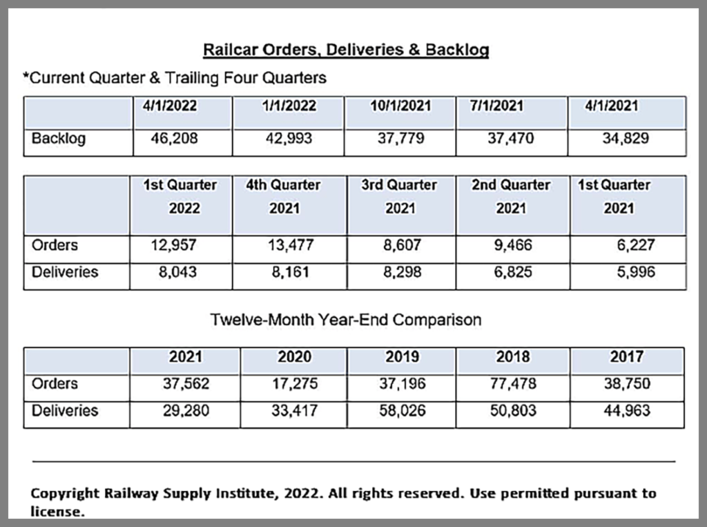 Newly released data from the Railway Supply Insitute American Railway Car Institute Committee (ARCI) shows orders and deliveries remaining steady in Q122. The total backlog grew by approximately 7.4%, to 46,208, compared to 4Q21, and 32.6% compared to the prior-year period.