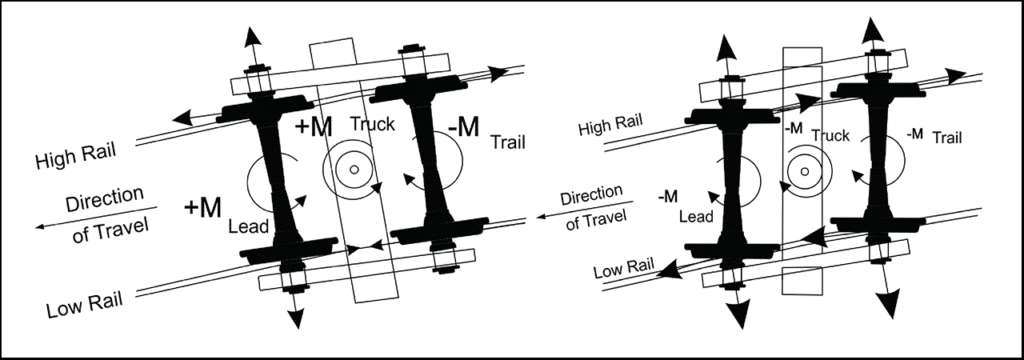 MxV Rail developed a test program to measure warp angles and warp-induced strains in the components of two cross-braced trucks operating in MxV Rail’s Facility for Accelerated Service Testing (FAST®) train. After collecting data while negotiating track curves as tight as six degrees during two weeks of FAST train operations, both trucks were removed and set up, in turn, in a laboratory environment per the “standard warp test” (5, 6). The laboratory warp test measurements were not intended to duplicate FAST measurements. Instead, these measurements were intended to be complementary; providing a means to assess the warp moment observed with strains in the brace rods and warp angles of the truck. This assessment included measuring the warp behavior both with and without wedges installed.