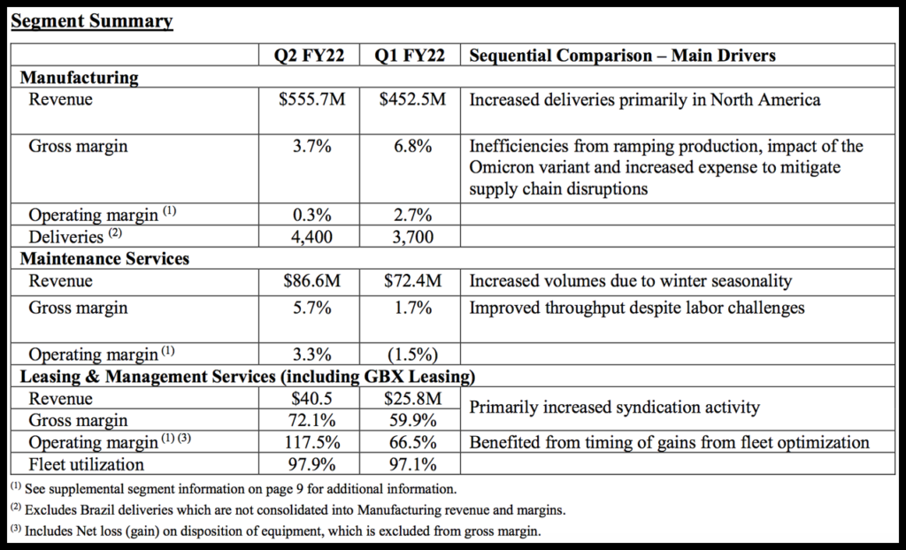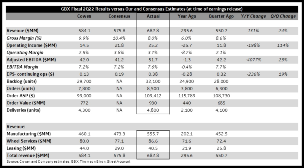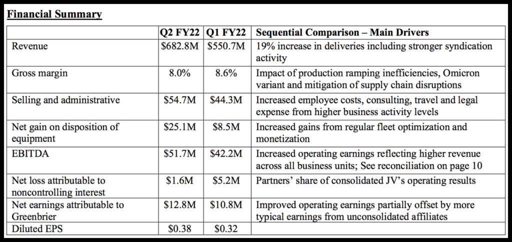 Following are Greenbrier’s second-quarter 2022 highlights:
