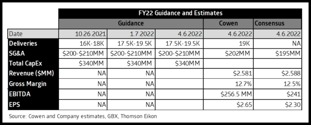 Based on current business trends and production schedules for fiscal 2022, Greenbrier said it expects deliveries of 17,500-19,500 units, including approximately 1,500 units in Greenbrier-Maxion (Brazil), and selling and administrative expense to be $200 million to $210 million. Additionally, it anticipates “[c]apital expenditures of $275 million in Leasing & Management Services, $55 million in Manufacturing, and $10 million in Maintenance Services. Net of proceeds of equipment sales of approximately $150 million, capital expenditures in Leasing & Management Services will be $125 million.”