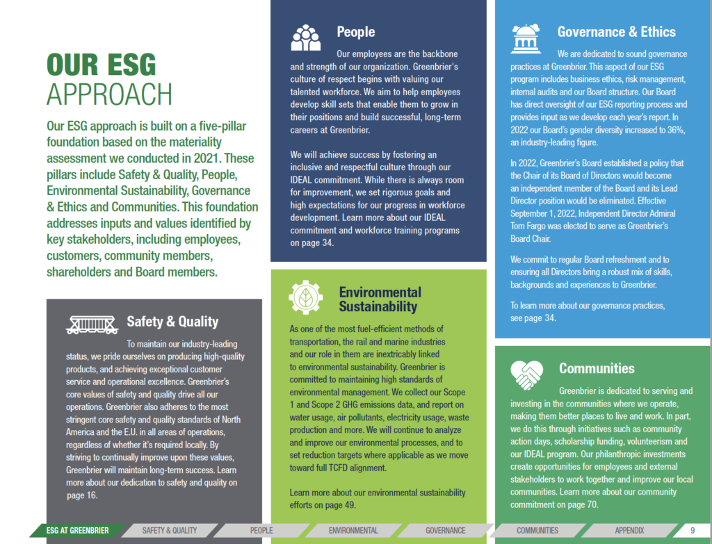 “Greenbrier’s ESG strategy is designed to drive real and sustainable improvements in areas where we can make the most impact,” said President and CEO Lorie Tekorius. “We know that ESG considerations are gaining prominence. Our stakeholders increasingly prioritize the need for our products and services to support their efforts to pursue a more sustainable and equitable future. Rail remains among the most environmentally friendly modes of freight transport. According to the Association of American Railroads (AAR), rail moves 40% of U.S. freight but accounts for only 2.1% at U.S. transportation-related greenhouse gas emissions. Our organization, from our Board to executive leadership to each individual team member, is committed to advancing our ESG goals. We look forward to providing updates on our progress.