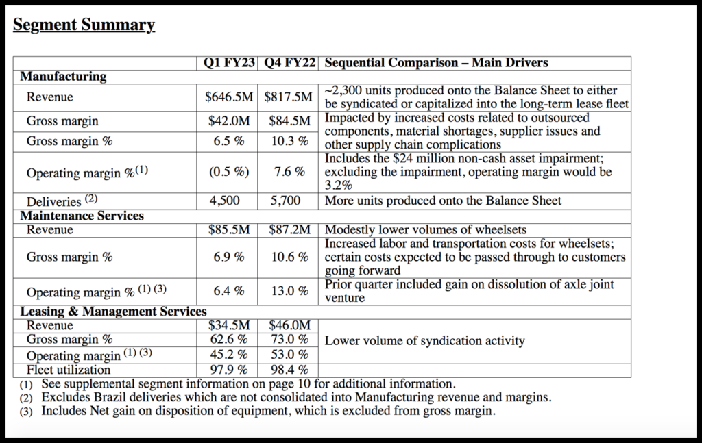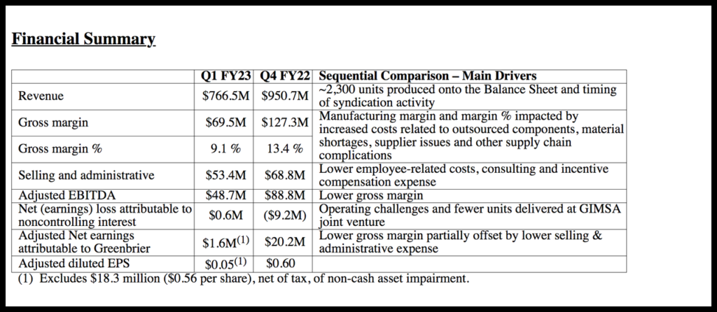 Following are Greenbrier’s first fiscal quarter 2023 highlights:
