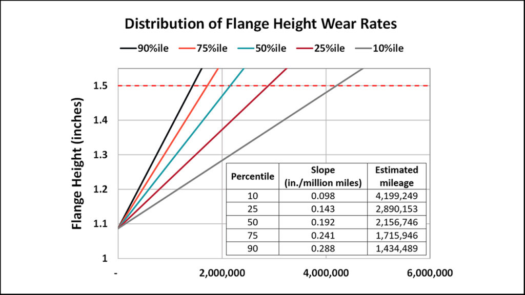 Figure 1 (above) shows the flange height wear rates with the data broken down into select percentile values with each value plotted linearly from new to the AAR condemnable criteria. This figure offers a theoretical representation to help visualize the number of miles it would take a new wheel to wear to the AAR condemnable limits based on the range of median wear rates identified and given the calculated slopes. The range of wear rates is quite large over this population of cars. Half of the data points fall in the range between ~2 million miles (orange line) and ~3.5 million miles (red line).
