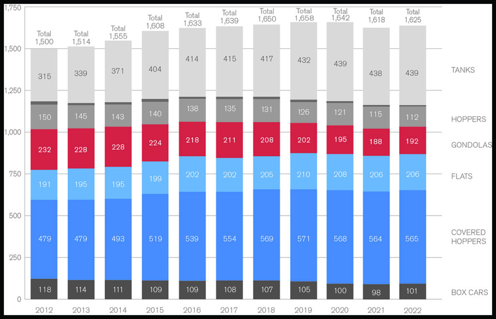 Hoppers were the single car type that decreased in the revenue-earning fleet, down by 2.0% over 2021. All other car types increased in 2022, with boxcars leading the gains by 2.6%.