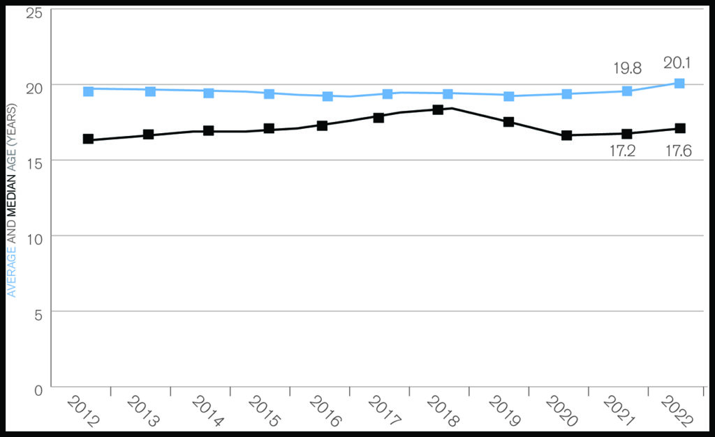 The average age of the revenue-earning fleet continued to climb in 2022. The average age rose to 20.1 years, its highest in more than a decade, continuing to suggest new cars were joining the fleet at a slightly lower rate than older cars were exiting last year.