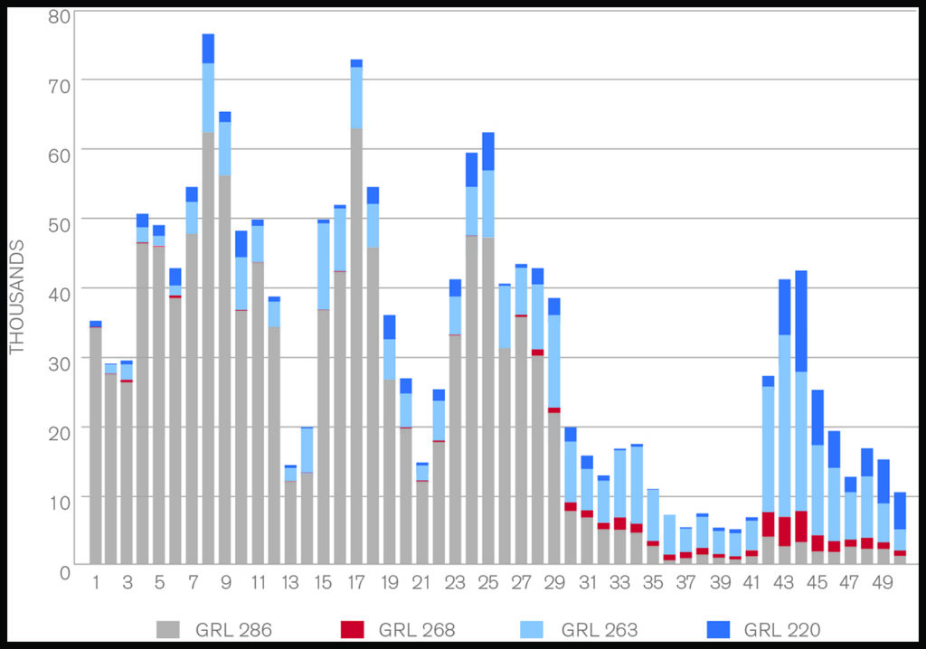 GRL 286 cars dominate among recent additions to the fleet because they enable operational efficiencies that reduce costs and ease logistics challenges. The fleet continues to add GRL 263 and GRL 268 cars, but at a much lower rate than GRL 286 cars. New GRL 220 cars also joined the fleet after seeing no cars added in 2021. The last year non-GRL 286 cars led among new additions to the fleet was 1992.