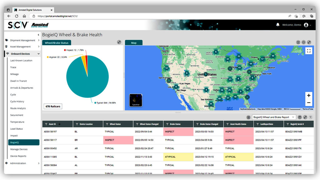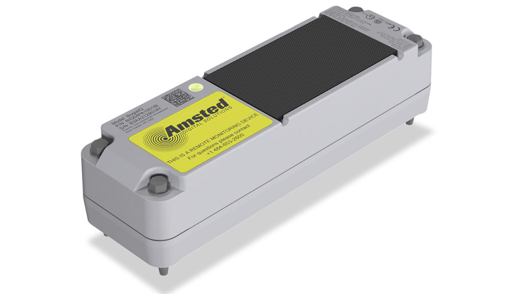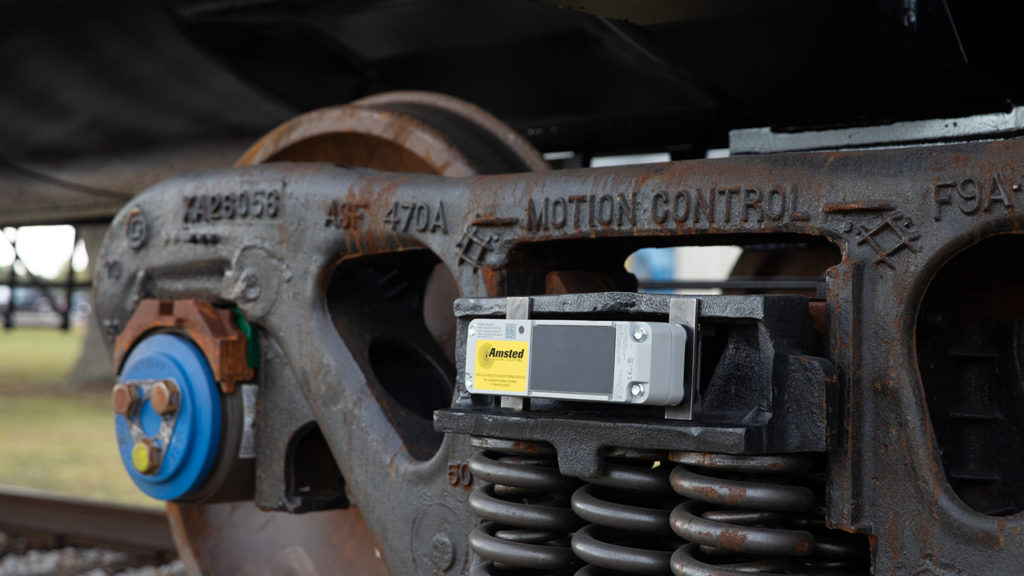 Described by Amsted Digital Solutions (ADS) as “a first-of-its-kind telematics system integrated directly into the bogie (three-piece truck),” Bogie IQ™ technology monitors wheelset conditions and brake system performance without wireless sensors. One device per bolster provides real-time onboard health monitoring with GPS-derived, machine learning-enhanced telematics data such as Dynamic ETA, first- and last-mile validation and “accurate mileage.” ADS’s Supply Chain Visibility™ software “provides a quick and easy means to manage by exception and review actionable information immediately.” This device, ADS notes, is “quickly and easily installed on any Amsted Rail® bogie” with specialty tools or hardware. Configuration can be done remotely. Built-in Object Character Recognition (OCR) and barcode scanning enables device association.