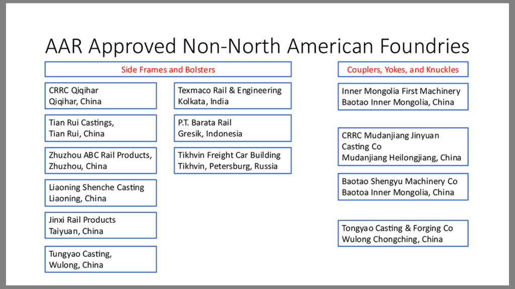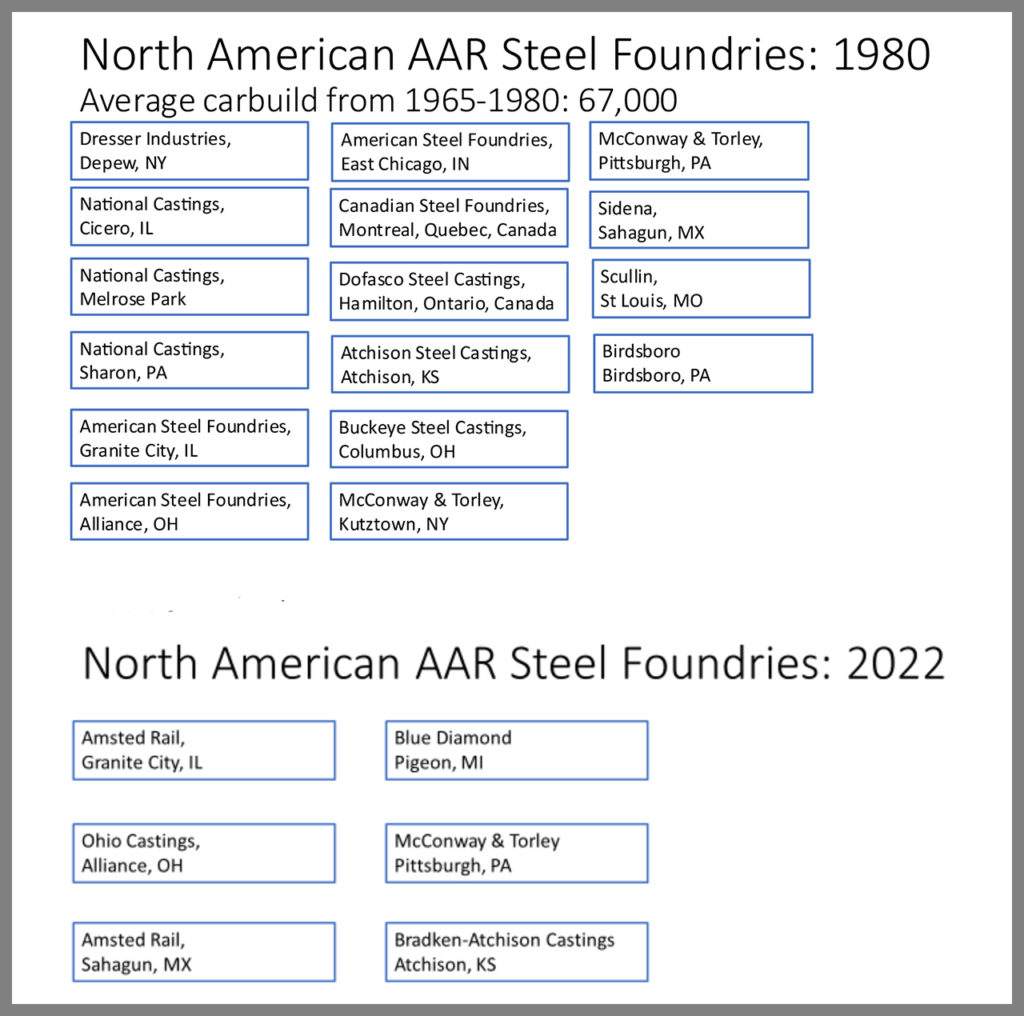 As background, in 1980, there were 16 steel foundries in North America producing side frames, bolsters, couplers, yokes and knuckles for freight railcars and locomotives. Two producers were in Canada, two in Mexico, and the balance in the U.S. Virtually all casting supply came from North America.